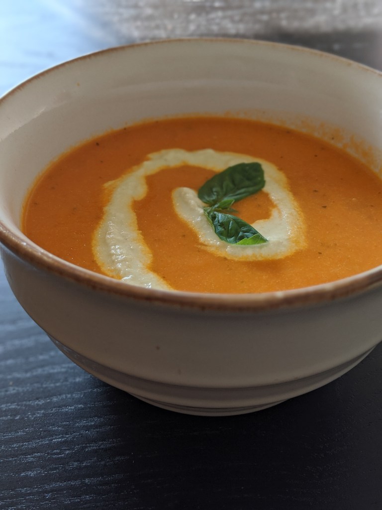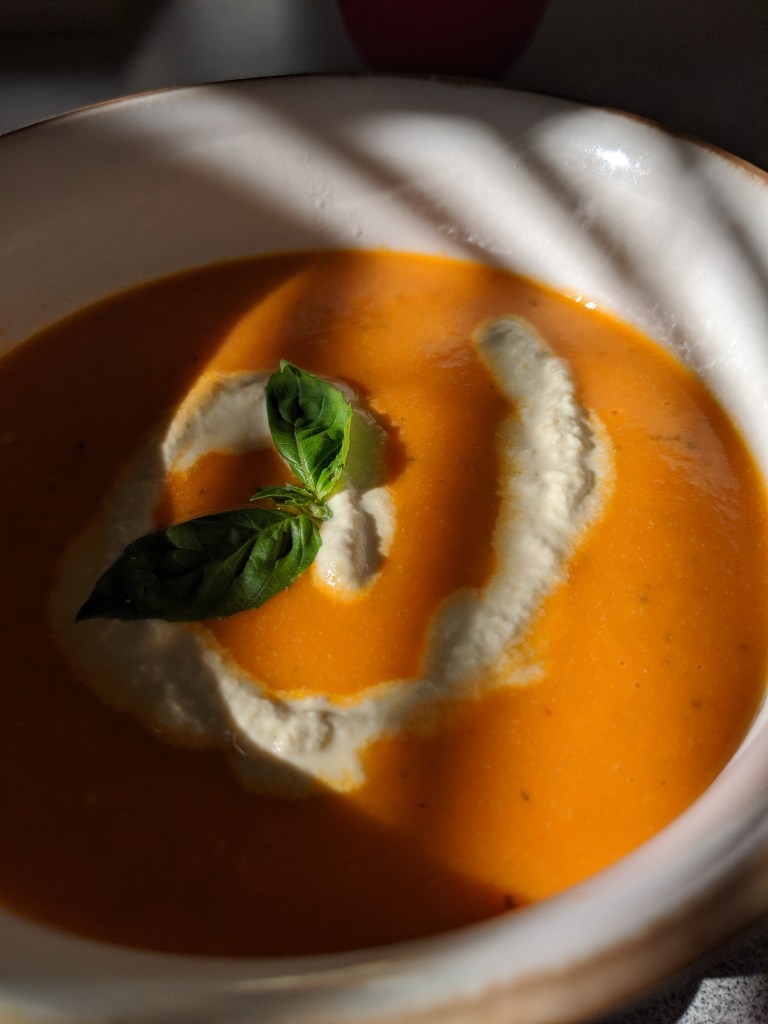 - Fold in the cashew cream to the soup, back in the pot, until fully incorporated. Add seasoning if needed and it’s ready to eat. If you have leftover basil you can be fancy and use it as garnish!
