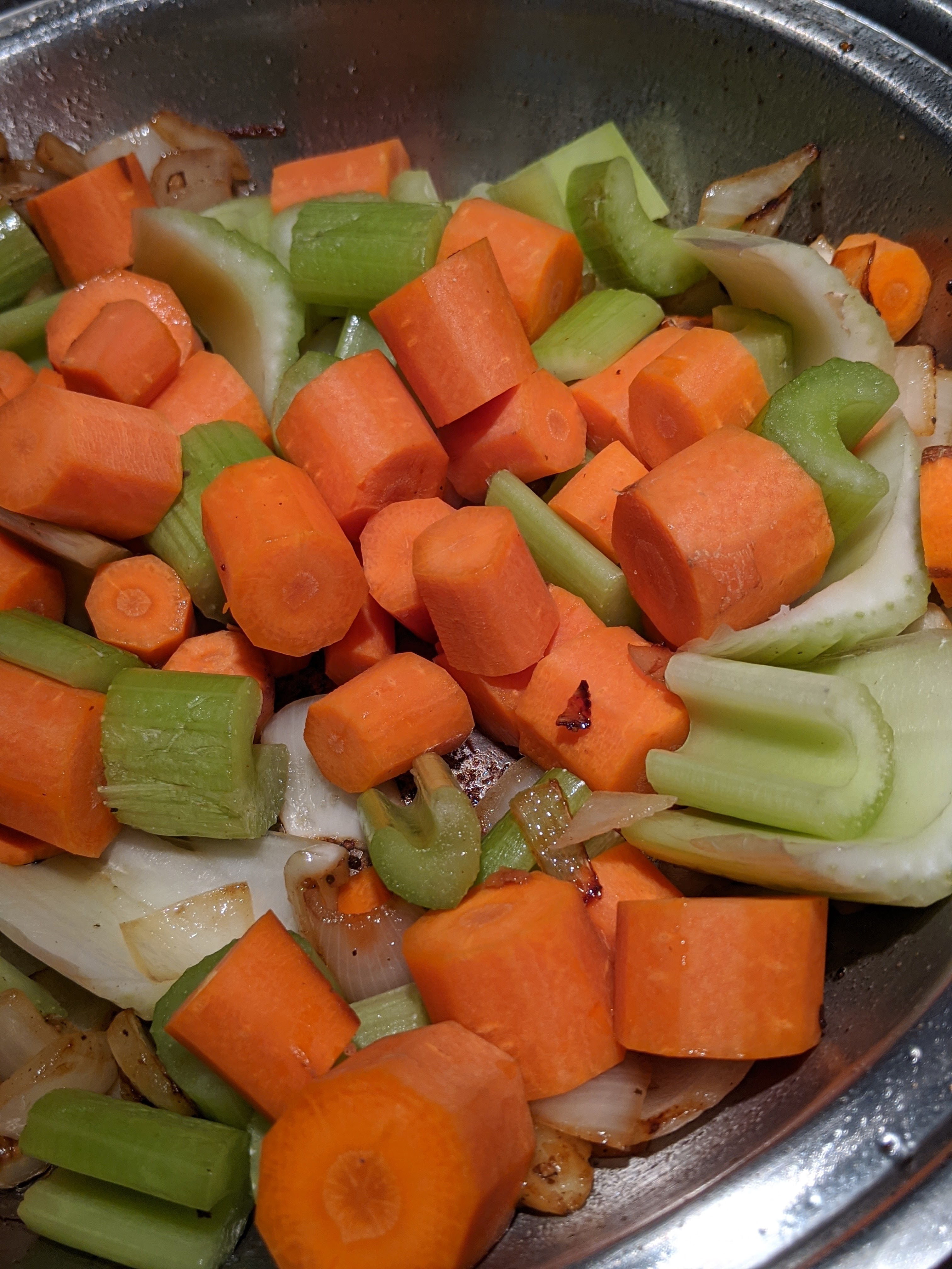 - in the pan that you browned your meat in, add your onions and saute till some parts get caramelized then add the garlic, celery, and carrots and cook down some more or until fragrant, about 7-10 minutes. Remove vegetables from pan and place them in with the meat.
