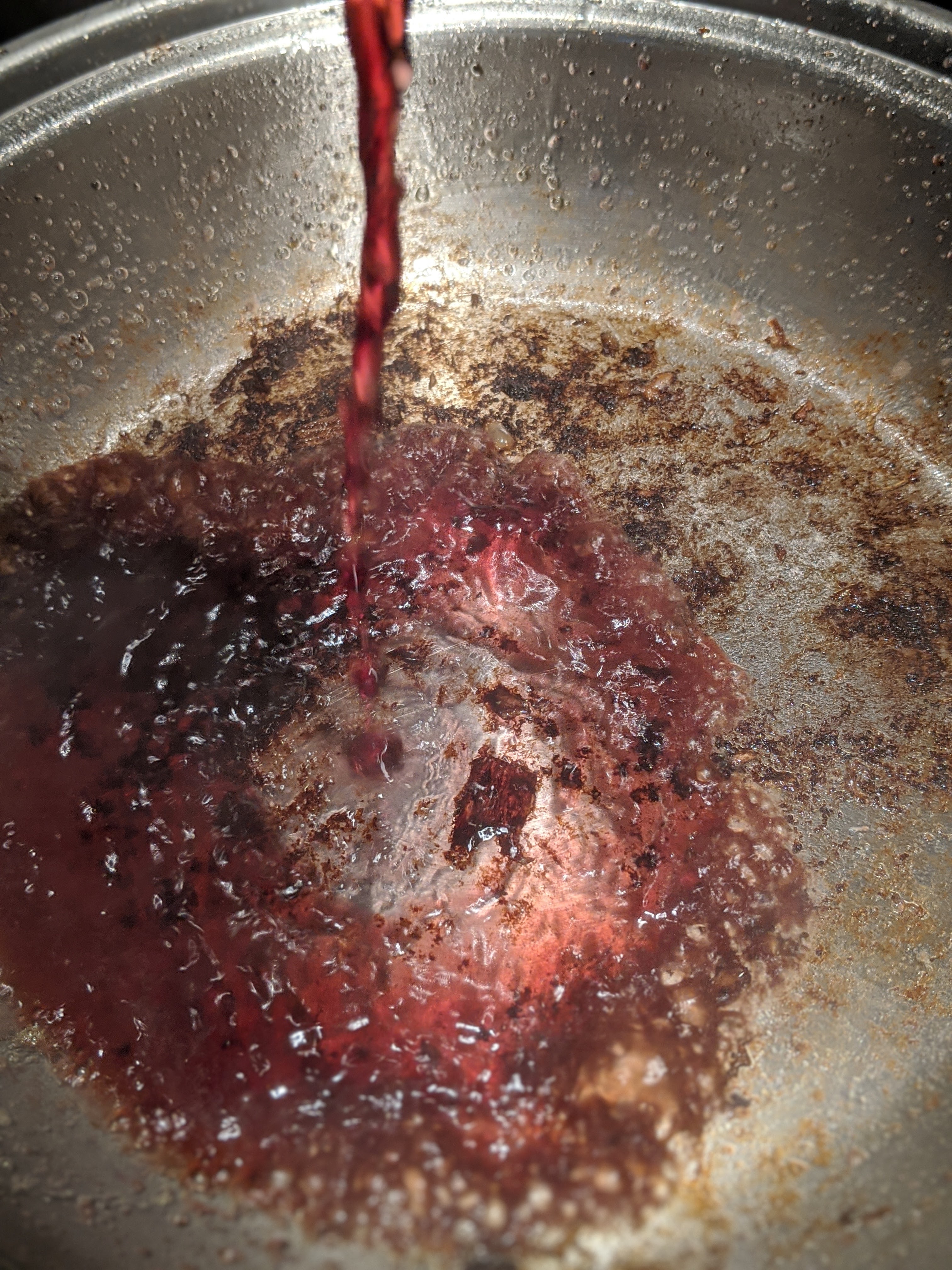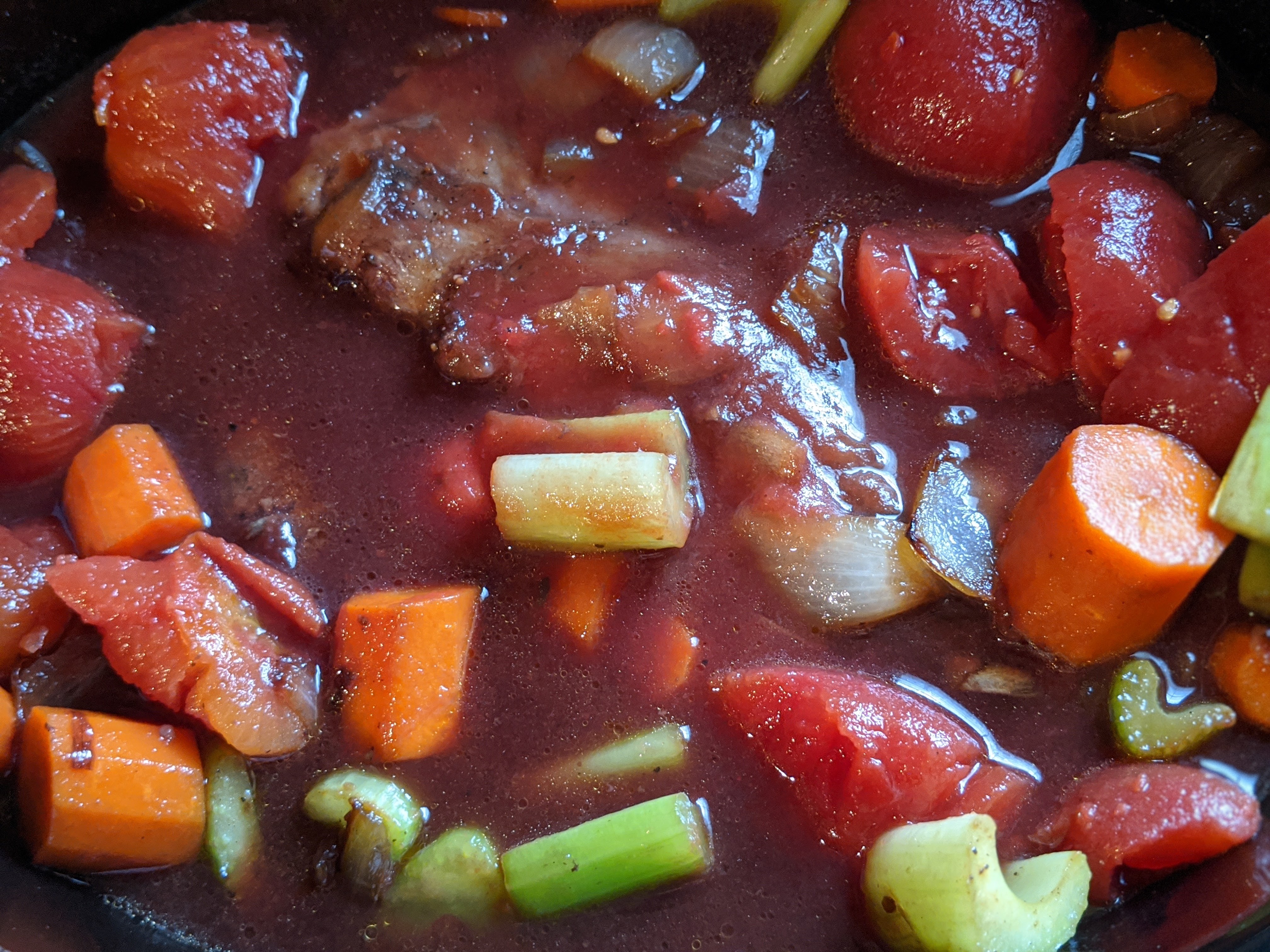 - Return pan to heat and deglaze with the wine making sure to scrape up all those tasty bits. Add the cooked wine and canned tomatoes to the slow cooker and your going to have that going on low for about 7-8 hours until the meat is tender and falls off the bone.