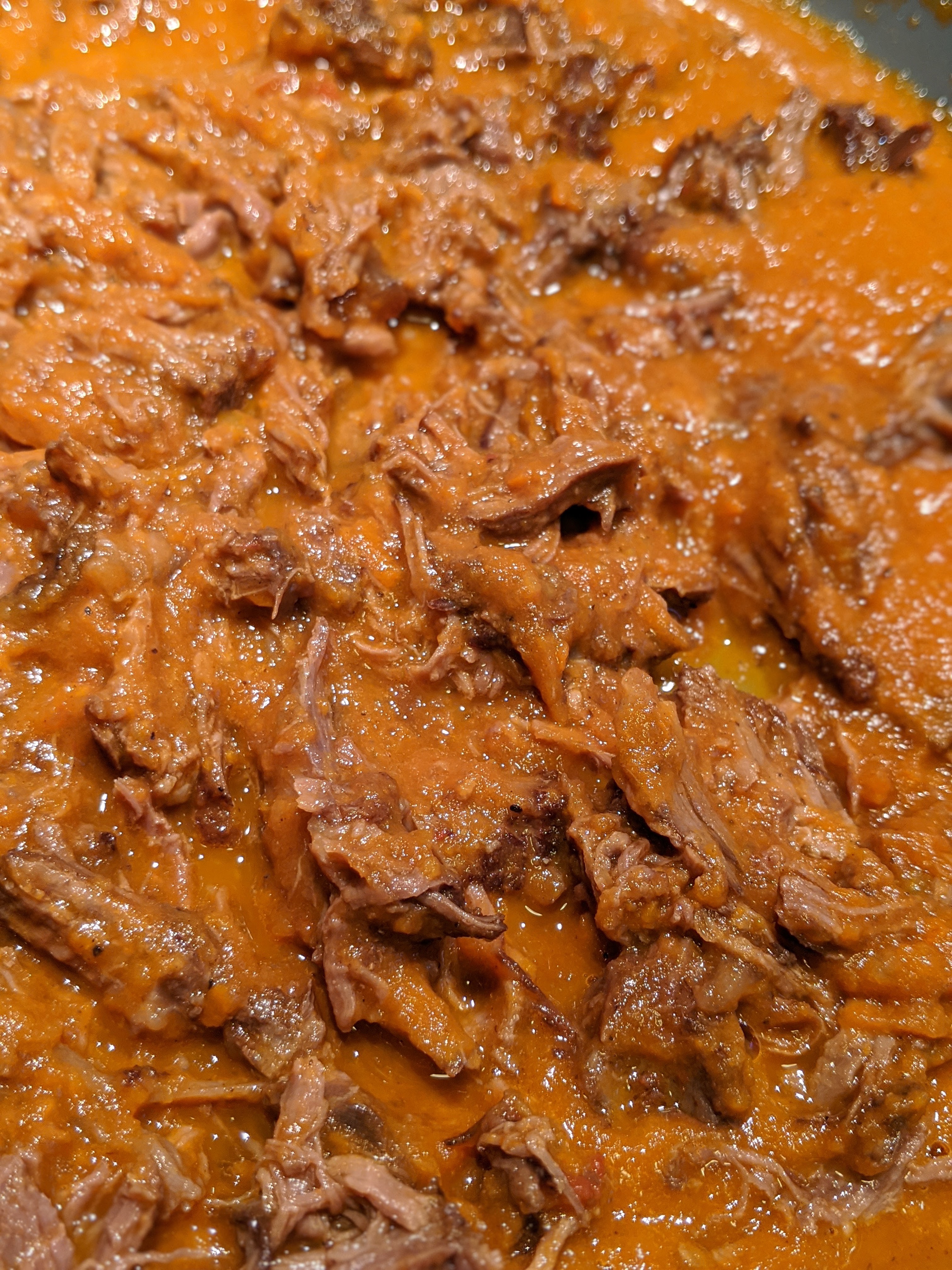 - Once done, remove the meat from the slow cooker and shred and set a side. With an immersion blender or blender, blend the sauce until smooth.