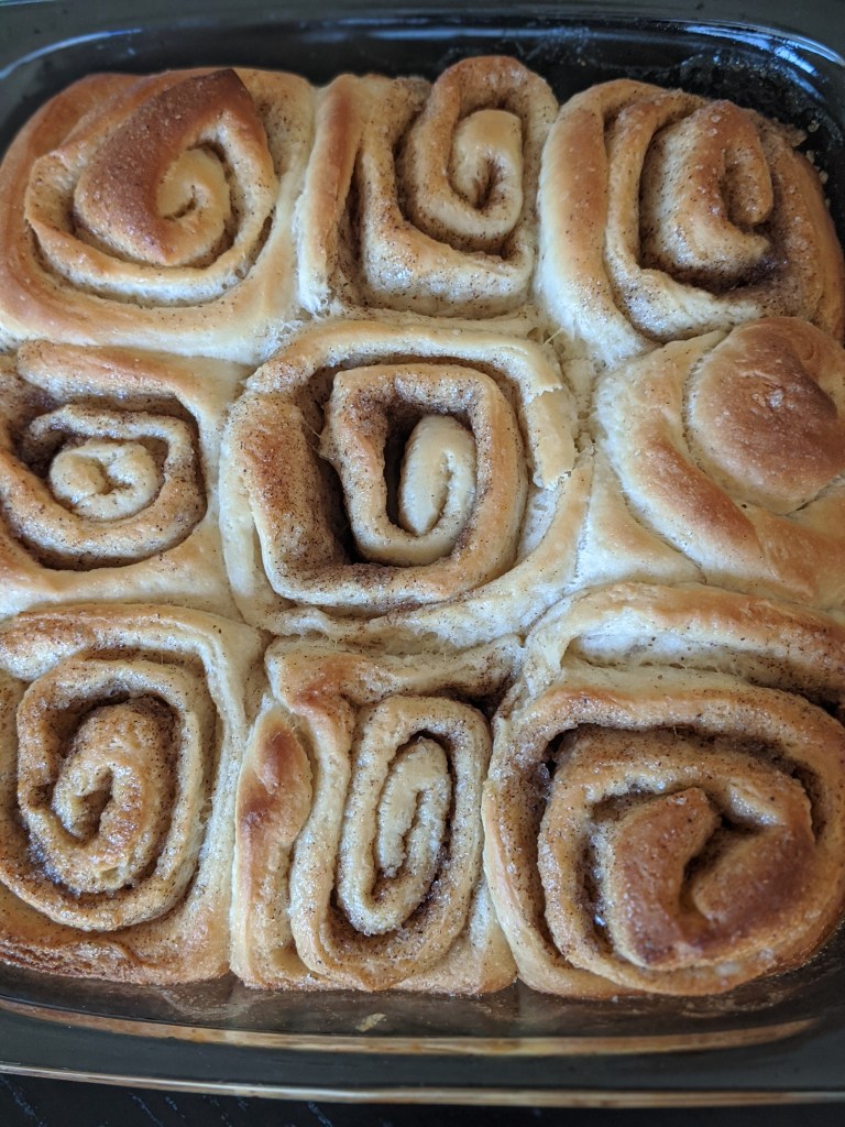 - Once your dough has doubled, put your dough on the counter and press it out into a 12″ by 12″ square. Spread the rest of your soft “butter” on then sprinkle your sugar spice mixture evenly over the whole thing. Roll the dough into a log, then cut into 9 pieces. Place rolls into a 9″ by 9″ baking dish, cover and let rise for half an hour.