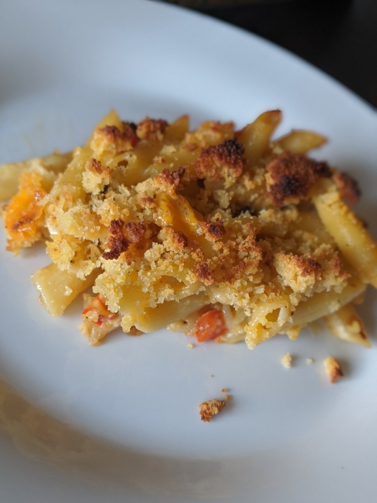 - Place your pasta into a baking dish and crumble the rest of the cornbread on top then place in the broiler until golden brown and crispy.